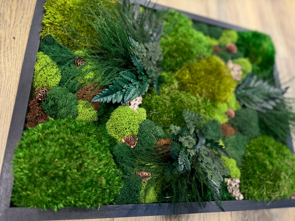 This collection features an array of preserved mosses in hues of green, mixed with various preserved ferns and lichen. No maintenance is needed for all collections. Do not water or place outdoors or in direct sun.